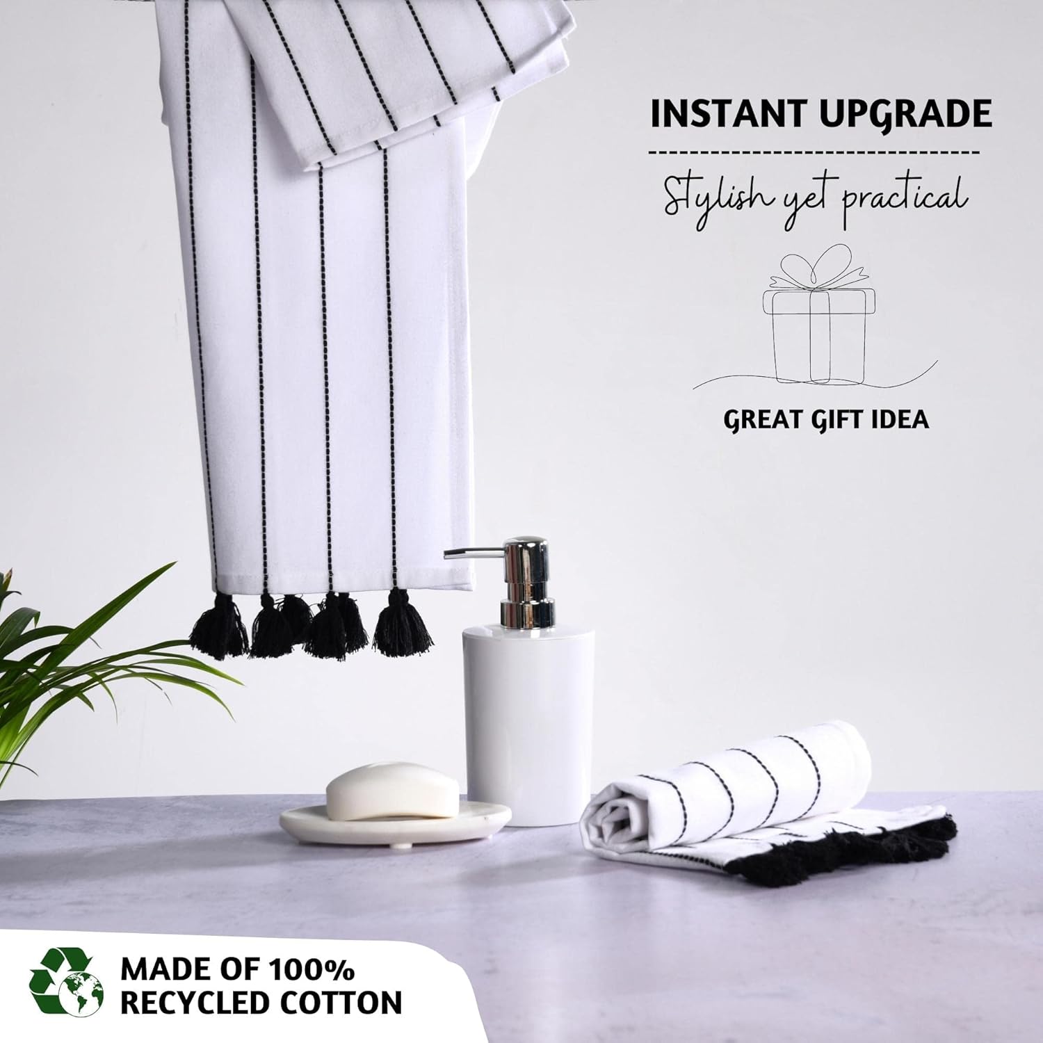 Enhance the Look of Your Kitchen or Bathroom with Folkulture's boho hand towels for bathroom. A hand towel is an essential item you use almost every day, be it drying off dishes in the kitchen, wiping off your hands in the bathroom, or wiping away sweat after a tough day in the gym. That’s why we have created these gorgeous hand towels that make for modern farmhouse bathroom décor and offer an ideal balance of style, softness, absorbency, and luxuriousness that you won’t find in heavy cotton towels or linens. We use 100% recycled cotton which means our boho hand towels are not only softer and more absorbent they actually get softer to the touch after every wash cycle. Each luxury Turkish hand towel or decorative towels for bathroom features durable tassels on the edges that give it a more vibrant, high-quality look and feel that really stands out and enhances your personal space. These hand towels for kitchen come in various designs that are simple and elegant with colors such as black, white, blue, and beige. Woven with premium organic cotton, these small hand towels add a decorative touch to your personal spaces and provide versatile use for washing or drying your face and hands, as a tea towel, gym and yoga, and more. Our bath towels feature a unique loomed, or tasseled, look that really enhances the look and feel of your room which makes them a great pairing for modern, farmhouse, or boho decor.