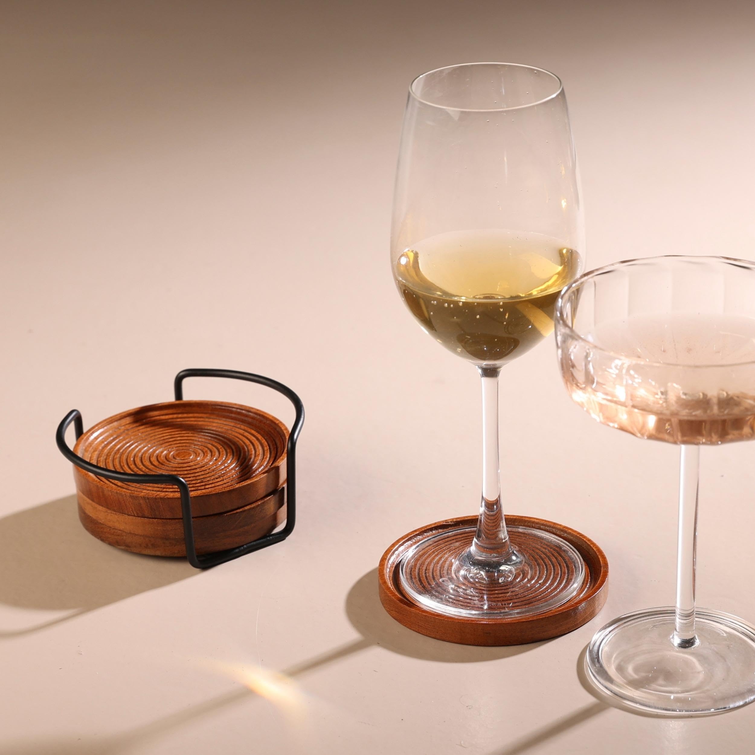 Folkulture Wooden Coasters for Drinks, Set of 4 (4") Round Wood Coaster with Holder, Rustic Farmhouse Coaster for Dining Table