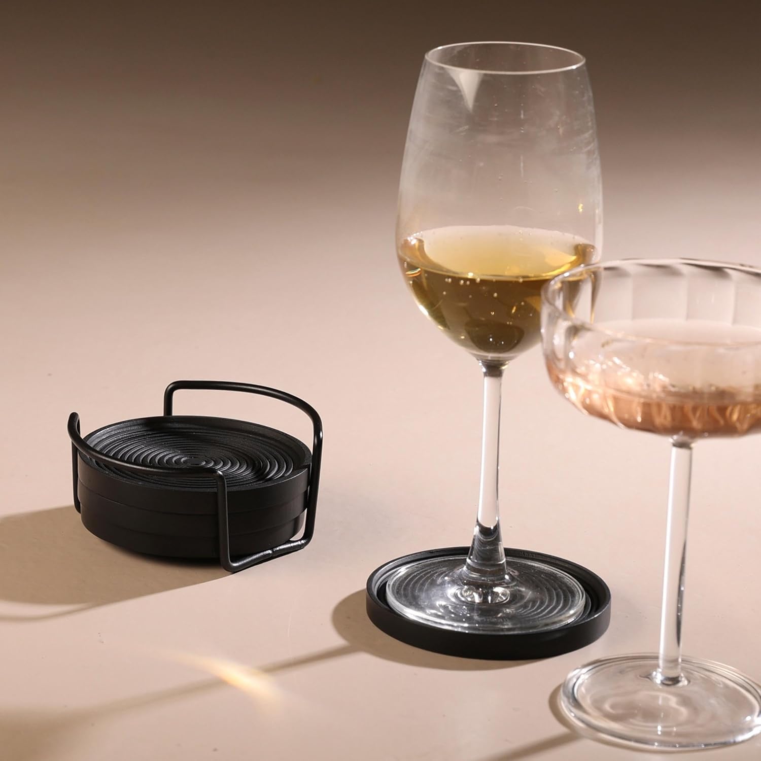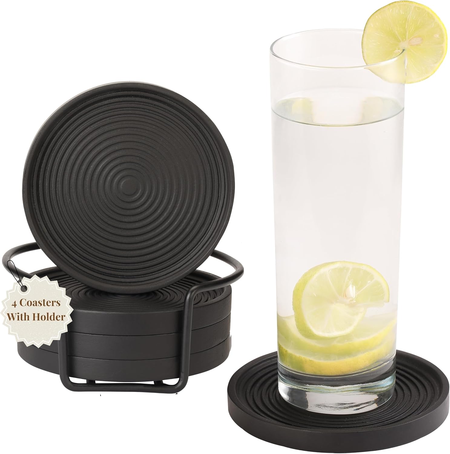 Folkulture Wood Coasters with Holder for Drink | Pack of 4, 4" Round Boho Coasters | Cute Coaster Set for Boho Decor, Farmhouse Decor (Black)