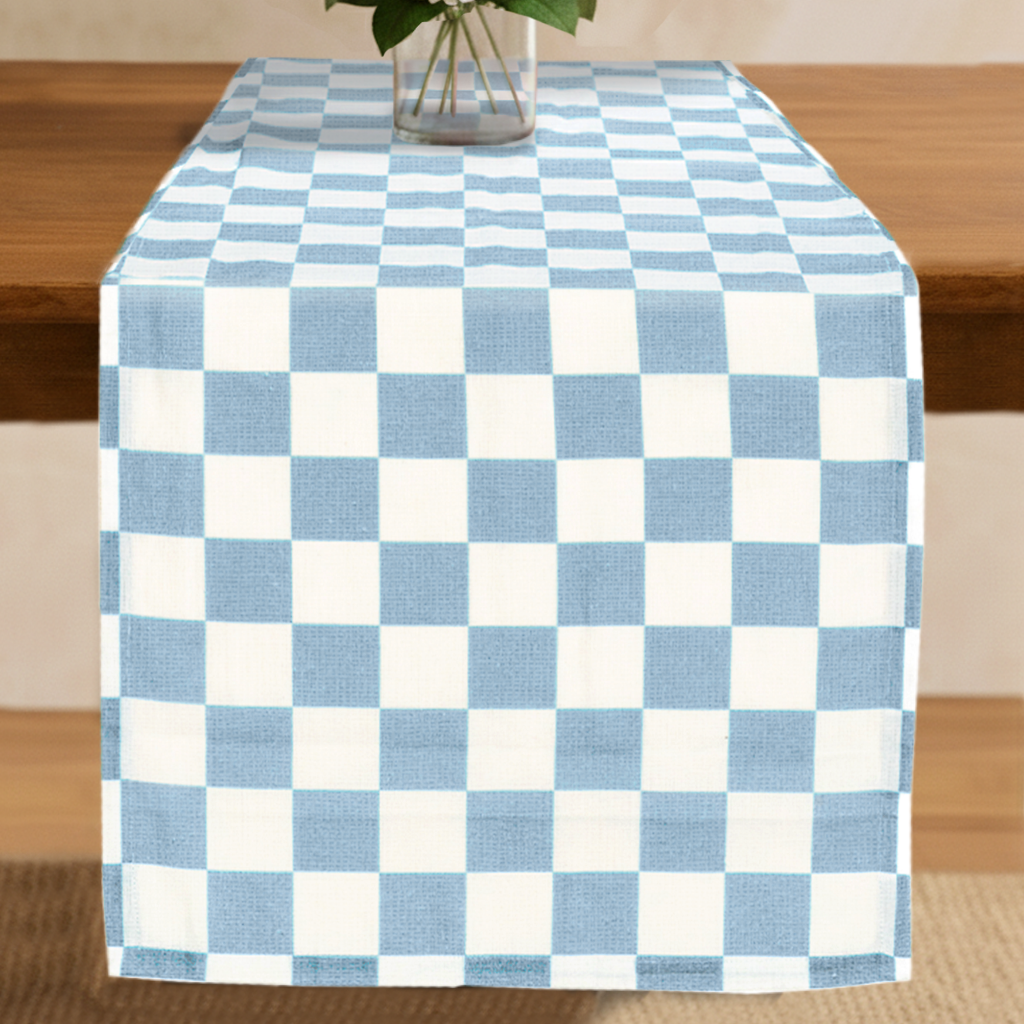 Folkulture Fall Table Runners, Checkered Boho Table Runners for Farmhouse Decor | White & Blue Table Runner for Fall Decor