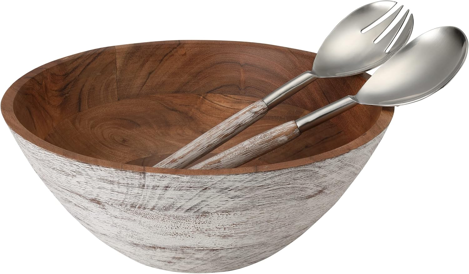 Folkulture Wooden Salad Bowl Set | 12" Acacia Large Bowl with Servers | Whitewash Mixing & Serving Bowl for Kitchen & Table Décor- White