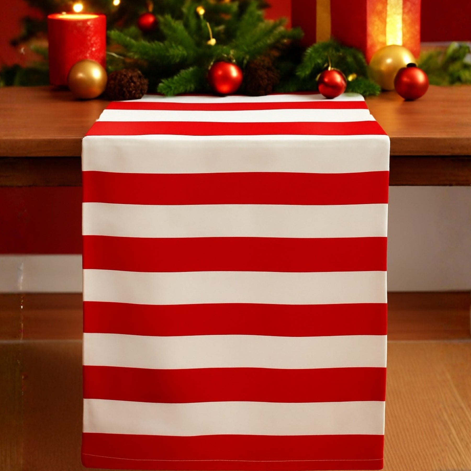 Table runner Horizontal stripes Red and White - Add a warm and festive touch to your home décor with the Folkulture Red and White Horizontal Striped Table Runner. Crafted from 100% durable cotton, this runner brings both charm and elegance to your dining table, coffee table, or console. Its bold red and white stripes make it the perfect accent for Christmas décor, fall gatherings, Thanksgiving dinners, or everyday styling. The soft, smooth, and colourfast fabric ensures long-lasting use, while its wash-friendly design makes cleaning and maintenance effortless. Whether you're creating a holiday tables cape or simply adding a vibrant pop of colour to your home, this table runner complements a range of interior styles with ease. It also makes a thoughtful and stylish gift for housewarmings, festive celebrations, and decor enthusiasts. Bring home timeless charm and seasonal cheer with this beautiful table accent.
